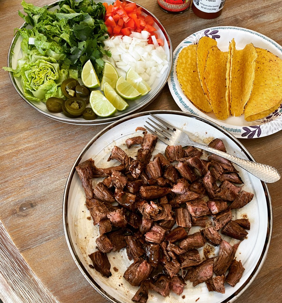 Start by marinating the steak for 2-3 hours before cooking. In the meantime, chop all your veggies and have it prepared. I like to warm up the tacos in the oven prior to eating, makes everything taste better.
