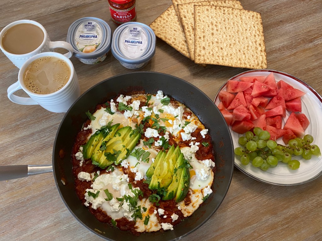 Once you’re ready to eat, sprinkle the feta and cilantro and add your sliced avocado. I served with sliced watermelon and grapes to give it the full Israeli feel.