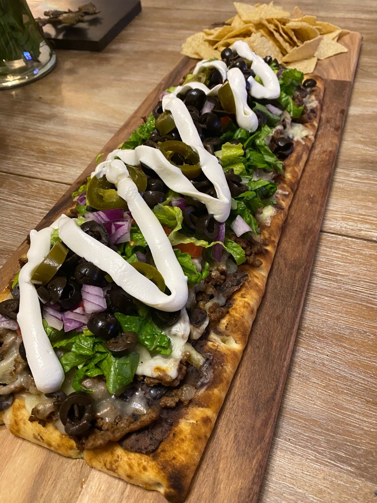 Start by spreading the beans on top of the pizza crust and then add the meat. Top the meat with the shredded cheese and broil in oven until cheese is melted. Once melted, take out of the oven and top with the veggies. Add sour cream on top. You can also add guacamole and hot sauce.