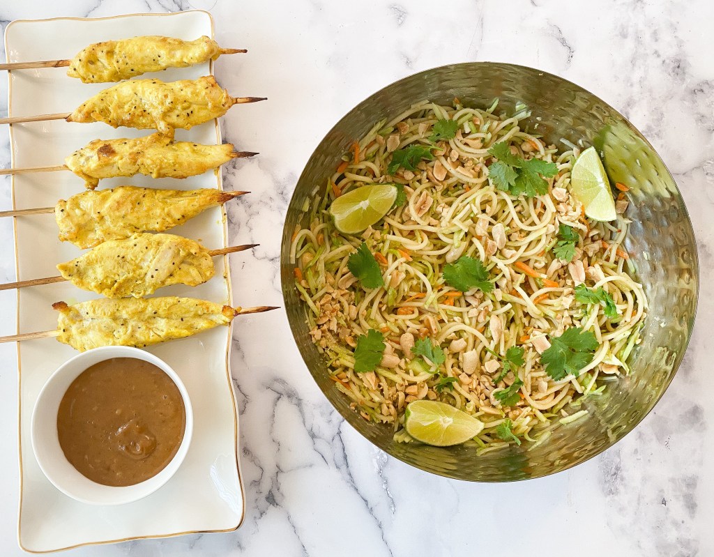 - Serve the skewers with peanut sauce of your choice, I used the Spicy Peanut Vinaigrette from Trader Joe’s.
